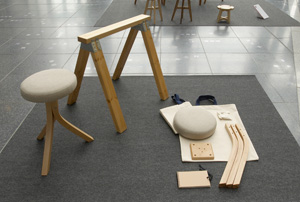 テーブルの下を掃除するとき、いっもいっつも椅子の脚が邪魔になるんです。で、ちょこんと椅子がテーブルに引っ掛けられて、掃除出来たらいいな〜って思って、そんなコンセプトでつくりました。
